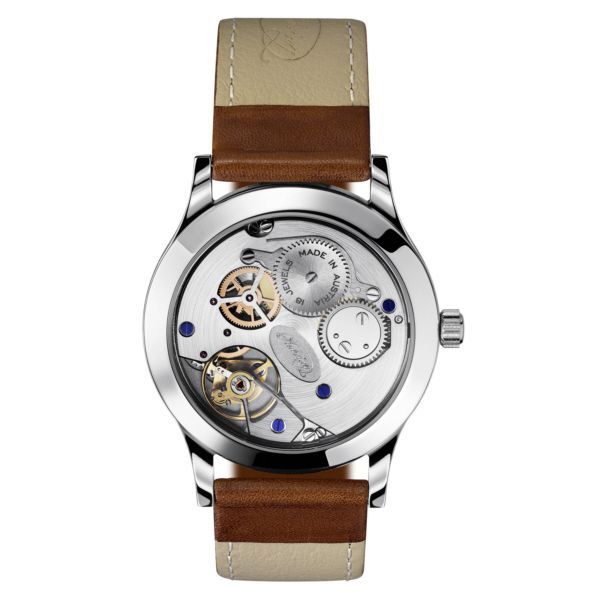 Erwin é bello quanto il suo fratello minore Felix, anche se leggermente più spesso. Il suo movimento con il secondo saltante è ancora sottile da 5,7 mm e la sua cassa da 9 mm si adatta comodamente anche sotto i polsini delle maniche aderenti. Ciò è reso possibile dal nuovo design del secondo saltante che è molto più piatto rispetto ai precedenti movimenti di orologi a carica manuale con questa piccola complicazione.